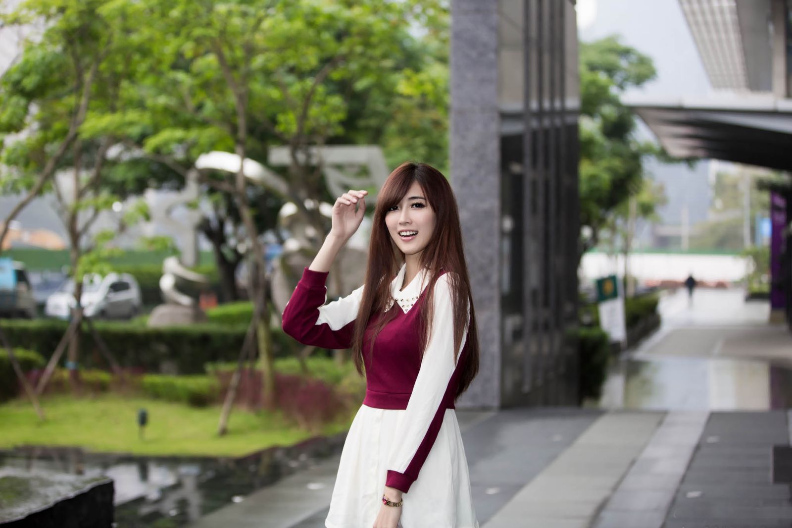 而下半身就显得没什么看点了,白色的长裙,长度一直到脚踝,长裙的质地也显得相对朴素,看起来很淑女,不是看起来很性感和风骚的风格。脚上穿了一双米色的高跟凉鞋,站在那里亭亭玉立。头发是散着的,波浪式的卷发一部分披在背后,一部分披在肩上。