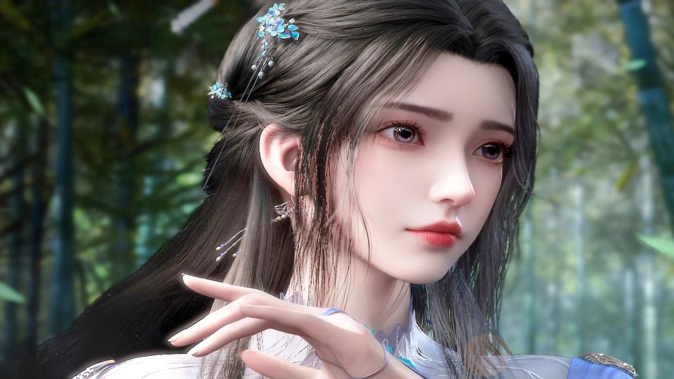 身影缓缓起身,身着天青色衣裙,蚕丝编制的衣裙如仙光一般在其光滑的身躯上流淌,她乌黑浓密的头发,盘成精致的发髻,点缀着玉簪、花朵等精美的头饰。她的侧脸线条柔美,神色温婉,透露出一种淡雅而宁静的气质。好似在漫天白雪中插入一抹柔和,带有淡淡的光晕,给人一种清新脱俗、仙气飘然的感觉。