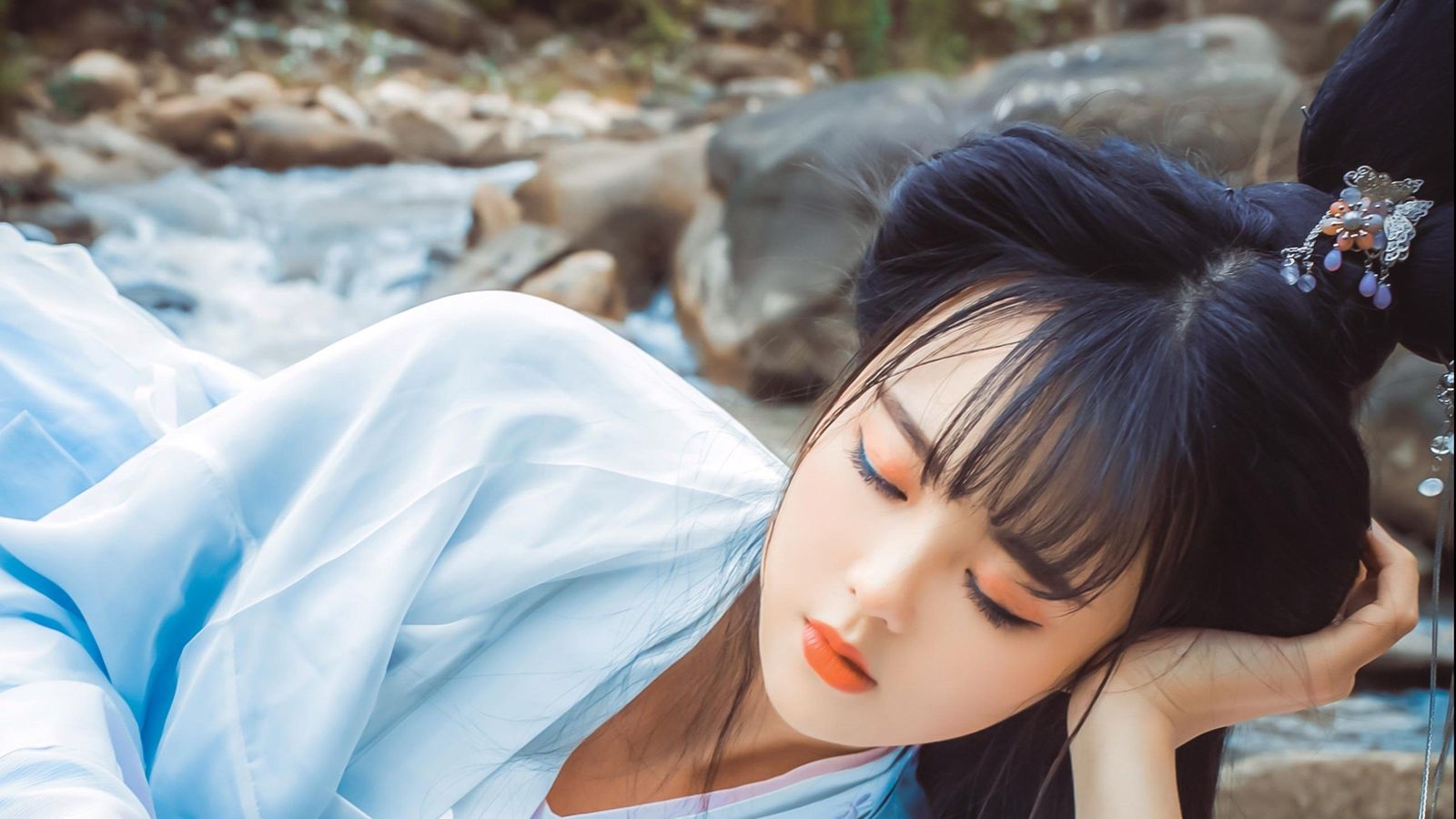 同时眼角上眺,眸里隐含着秋水。